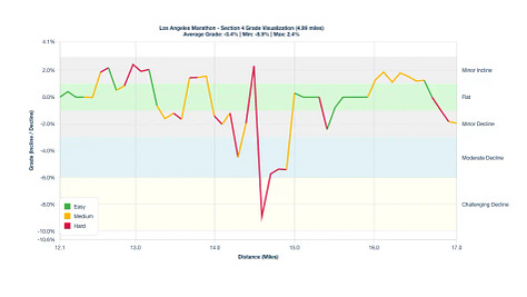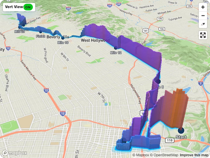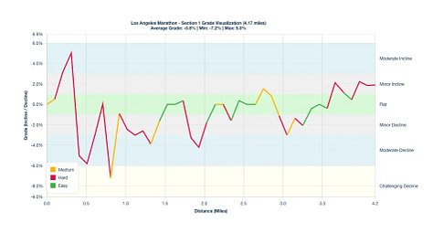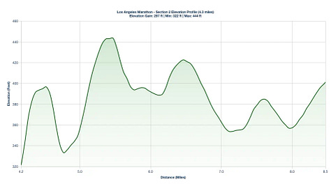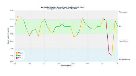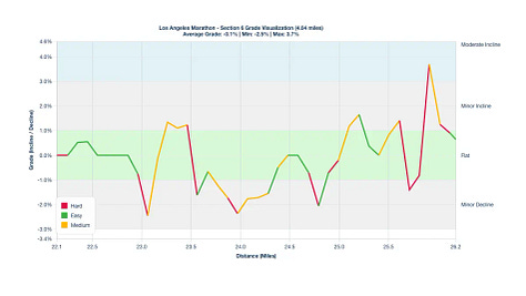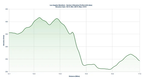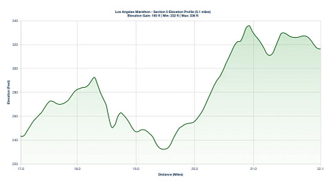 Century City Drag: Around mile 20 on Sepulveda Boulevard, there is a subtle Minor Incline that will feel much harder than its actual 1.5% grade. Use the energy from the Mile 20 aid station to power through.