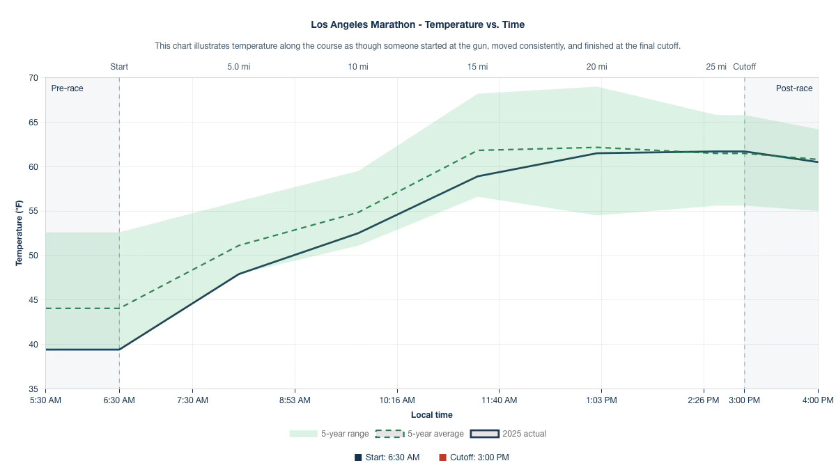 The full field officially starts at 7:00 AM, just before sunrise at 7:12 AM, meaning runners will toe the line in brisk, pre-dawn conditions. Historical temperatures at the start hover in the low 40s°F, climbing into the mid-60s°F under mostly clear skies as the morning progresses—presenting favorable conditions for athletes who manage their hydration and pacing effectively.